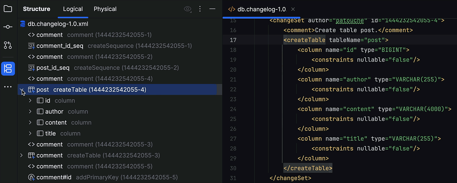 通过 IntelliJ IDEA 2025.1 中的 Logical(逻辑)代码结构视图,您现在可以获得更有意义的结构表示和专为 Liquibase 更改集定制的简化导航。 通过直观概览轻松探索和管理更改集,概览可以高亮显示其逻辑层次结构,这将帮助您在处理数据库架构更改时保持有序高效。