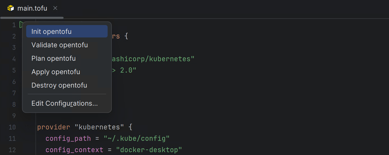 IntelliJ IDEA 2025.1 为 .tofu 文件引入了交互式装订区域操作,用于在开源基础架构即代码 (IaC) 框架 OpenTofu 中定义云资源。 借助这项新的装订区域集成,您可以直接从编辑器执行关键 OpenTofu 命令,无需切换到终端。 编辑器装订区域中的可点击图标会打开一个包含常用操作(例如 Init(初始化)、Validate(验证)、Plan(计划)、Apply(应用)和 Destroy(销毁))的菜单,让您可以随时使用基础架构命令。