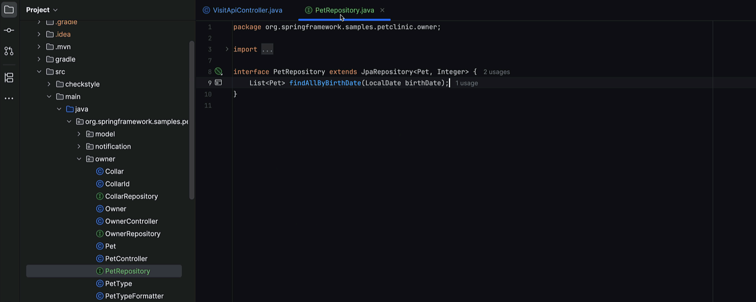 IntelliJ IDEA 现在会自动为您创建 Spring Data 仓库。 输入实体名称后,如果仓库不存在,IDE 将建议创建。 选择仓库类型并添加派生查询方法和处理提取的数据,无缝继续工作。