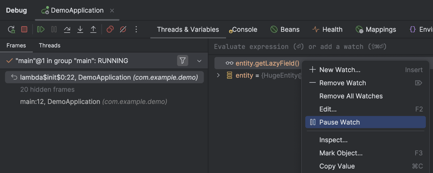 现在,您可以暂停和恢复监视的求值,控制监视计算可能产生的副作用。 只需在求值期间右键点击监视并选择 Pause Watch(暂停监视)即可。 暂停时,它不会求值和报告错误。 要恢复求值过程,请点击上下文菜单中的 Resume Watch(恢复监视)。