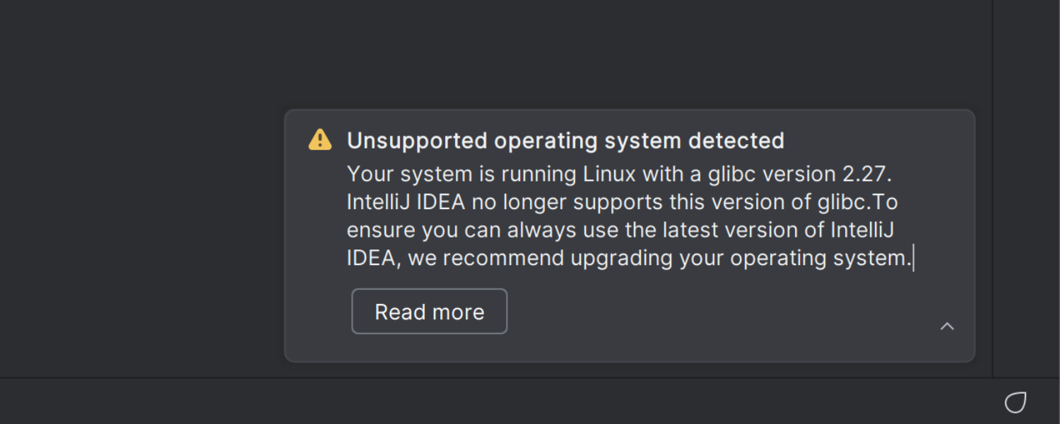 IDE 不再支持运行低于 2.28 版本的 glibc 的 Linux 发行版。 如果您的系统使用不受支持的版本,IntelliJ IDEA 将在启动时显示警告。