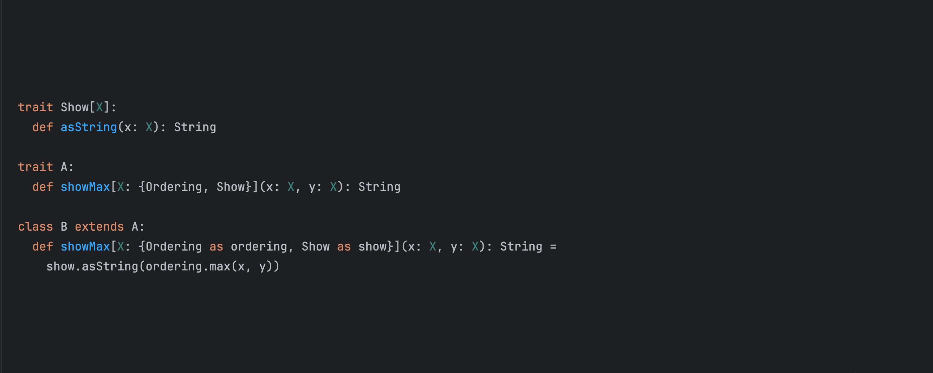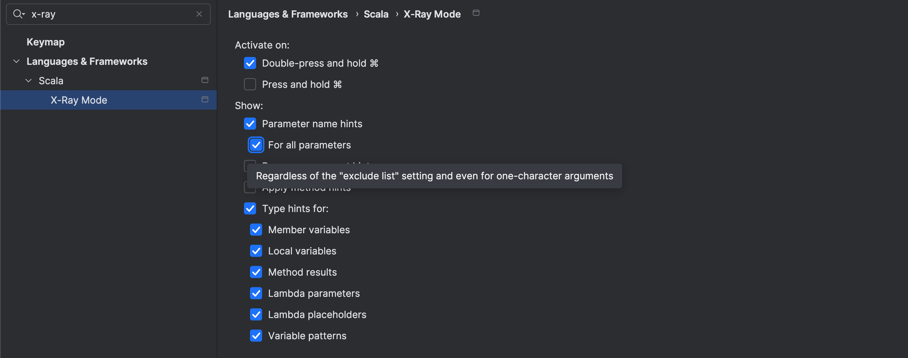 在 2024.3 版本中,我们引入了对 Scala 3 中透明内联方法的支持。 我们继续推进对 Scala 宏的支持,现已提供对 Scala 2 宏类型的支持。 我们还改进了变量模式、生成器和文字形参的类型提示,以及下划线形参和 kind-projector 语法的类型信息。