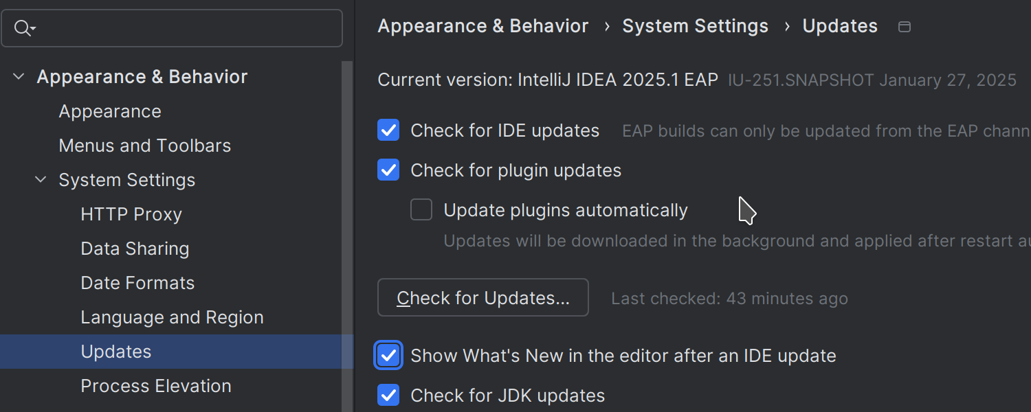 您可以设置 IntelliJ IDEA 在后台自动更新插件。 它将下载可用更新,并在下次 IDE 重启时应用,无额外通知。 您可以点击更新对话框中的 Enable auto-update(启用自动更新)复选框或通过 File | Settings | Appearance & Behavior | System Settings | Updates(文件 | 设置 | 外观与行为 | 系统设置 | 更新)启用自动更新。