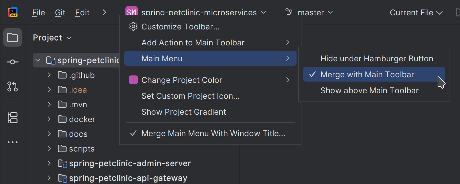 对于 Windows 和 Linux 用户,IDE 现在提供了一个将主菜单与主工具栏合并的新选项,有助于创建更精简的界面。