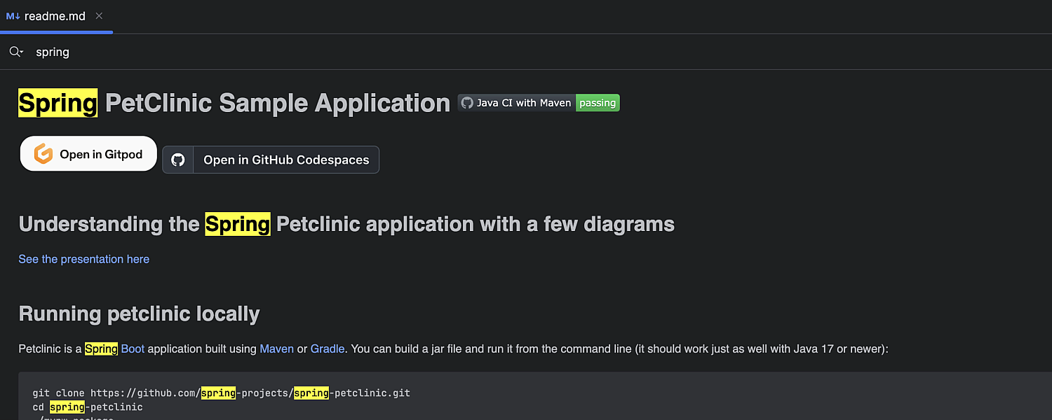 在 IntelliJ IDEA 2025.1 中,您可以在 Markdown 预览中进行搜索。 由于 README.md 预览通常是您在打开或克隆项目时首先看到的内容,本次更新使您能够更轻松地立即找到关键信息。