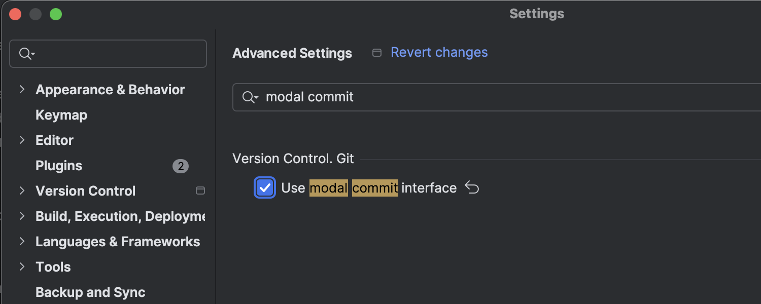根据我们在抢先体验计划期间收到的大量反馈,我们正在改进非模态提交工作流(默认的内置选项)。 模态提交界面现已成为插件,可以在 Settings | Advanced Settings | Version Control. Git(设置 | 高级设置 | 版本控制. Git)中激活。 在 2025.1 版本中,插件将与 IDE 捆绑在一起,因此您将能够继续使用该界面,而无需手动安装。