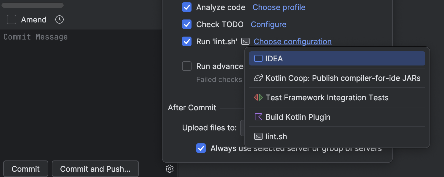 现在,您可以启动任意工具来执行提交前检查以及检查和格式设置。 自定义检查可以在 Run Configuration(运行配置)对话框中配置为运行配置。 这有助于您尽早发现潜在问题并确保代码在提交之前符合项目标准。