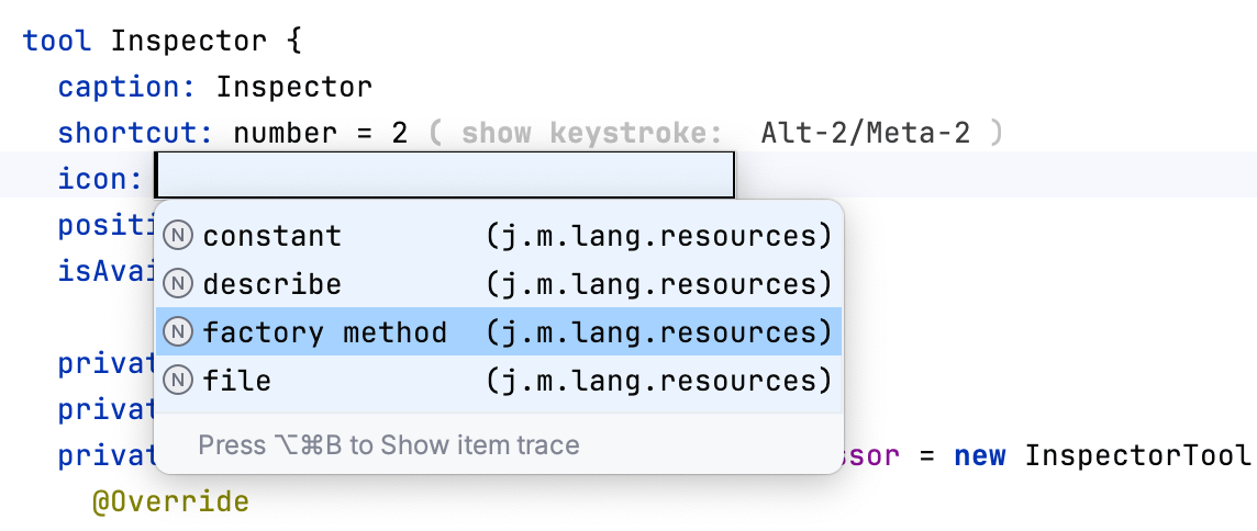 除了现有的 TextIcon、FileIcon 和 ConstantFieldIcon 概念之外,现在还新增了 FactoryMethodIcon 概念。 它可以通过引用创建并返回 javax.swing.Icon 实例的具体静态工厂方法声明来指定图标。