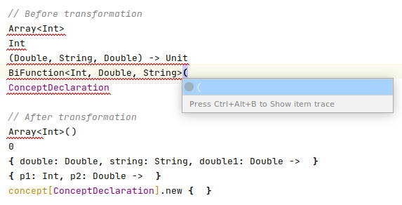 现在,可以输入左圆括号,然后使用右转换为给定调用创建构造函数调用。 这适用于支持此操作的任何 Kotlin 类型(这对于用户类型可扩展),并且可以更好地为给定类型创建默认表达式,例如从函数式接口类型创建 lambda 时。