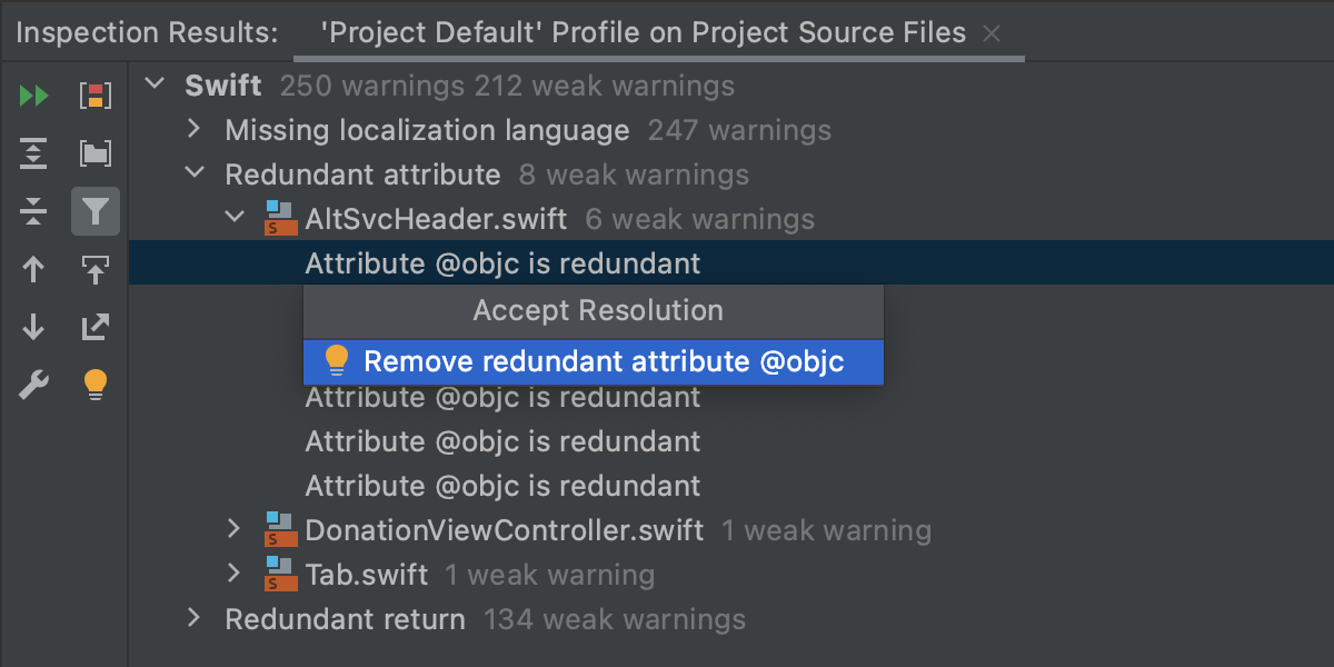 如果您希望消除整个代码库中的特定问题,可以使用 Run inspection by name (⌥⇧⌘I),然后选择所需范围。 将打开一个单独的窗口,其中包含检查结果,您可以在这里将问题重新分组,并向所有问题批量应用快速修复(如适用)。