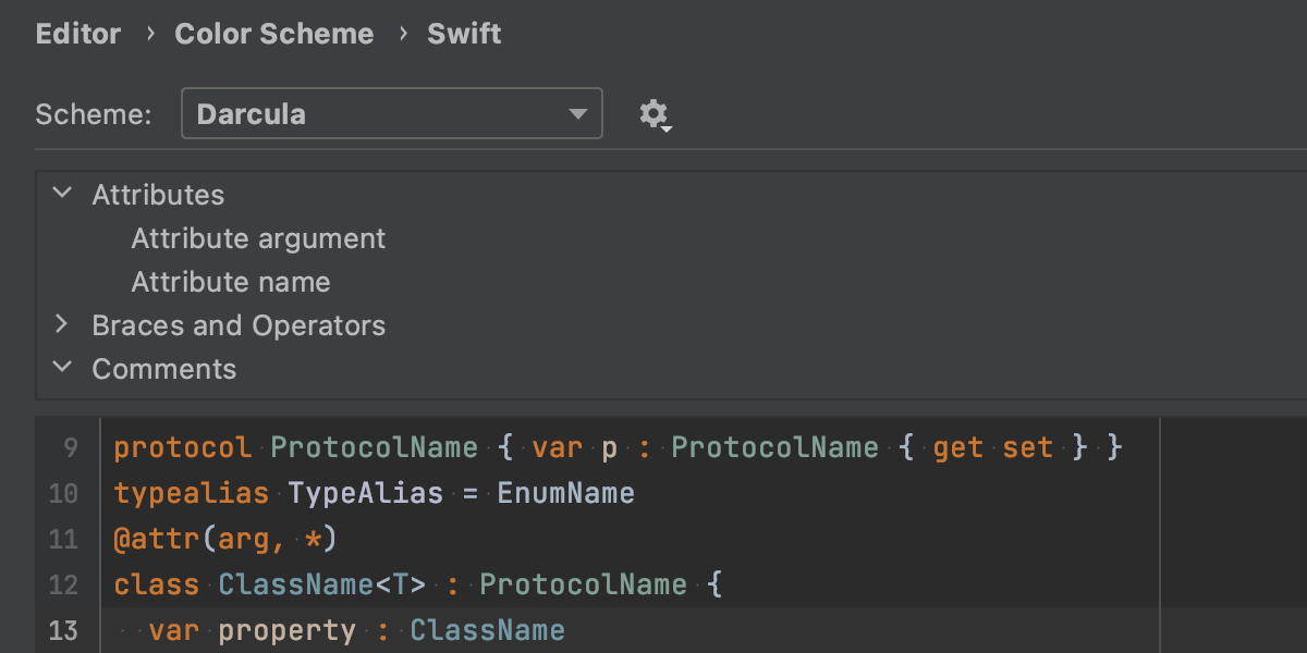 配置编辑器是 UI 自定义不可或缺的组成部分。 AppCode 捆绑了多个编辑器配色方案,并允许您创建自己的自定义方案或修改现有的方案。 您还可以从 Xcode 导入您喜欢的配色方案。