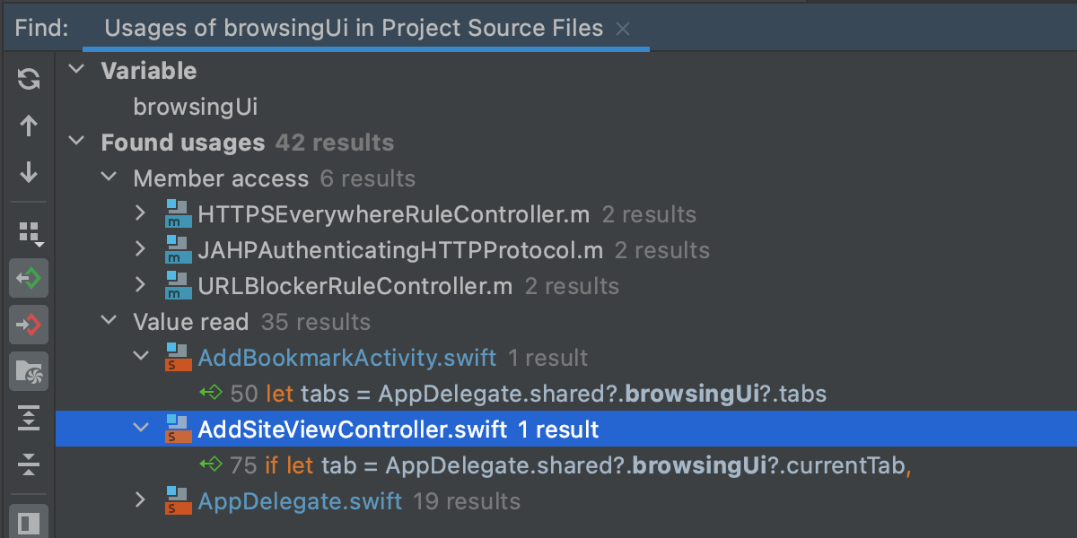 AppCode 中的 Find Usages 可以达到语义级别,能为您显示真正的用法,而不仅仅显示文本匹配。 此外,它还可以理解本地化、CoreData 和 xib 文件,并与它们一起使用。 您还可以按 ⇧⌘F7,高亮显示当前文件中的任意引用用法,随后在它们之间进行跳转。