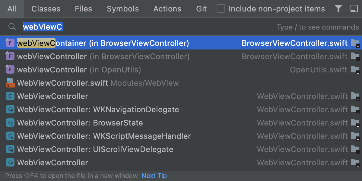 按照名称在整个项目中搜索类 (⌘O)、文件 (⇧⌘O) 或符号 (⌥⌘O)。 补全功能可以帮你快速找到最合 适的名称。