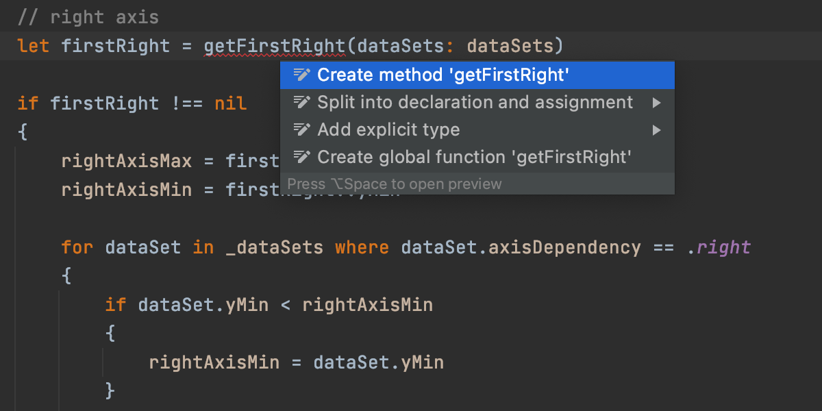 如果存在可以帮助您改善代码的意图操作,您将在编辑器左侧装订区域中看到一个灯泡。 此外,您还可以随时通过 ⌥Enter 调用可用的意图操作。
