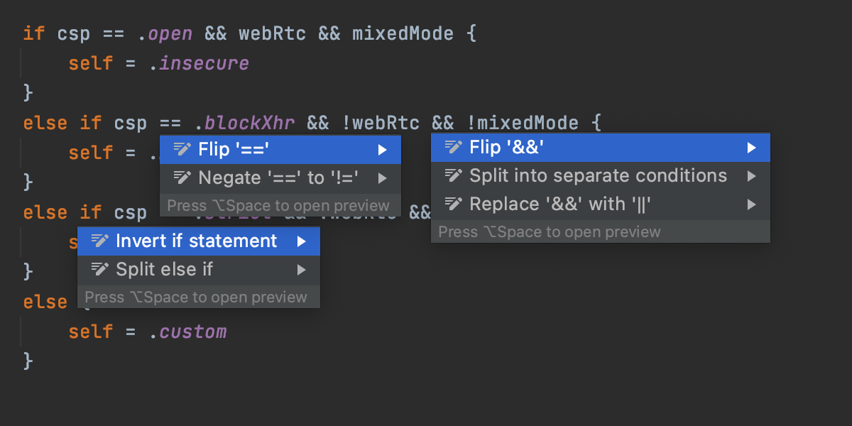 有多个意图操作可以改善您的代码,或者让日常编码工作更轻松。 根据用法创建符号,声明方法,交换布尔表达式的部分,合并嵌套的 if 语句,生成 switch case 等。