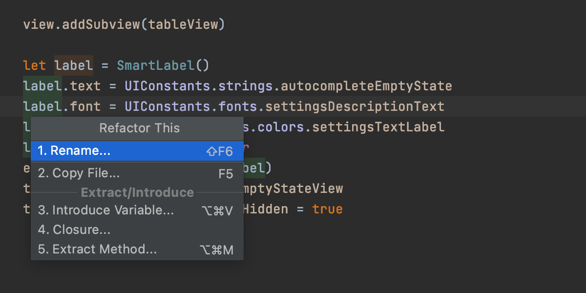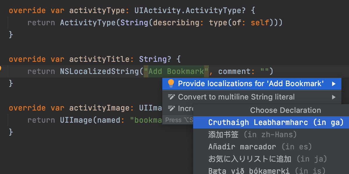 您在开发多语言应用吗? AppCode 可以让您的工作更简单。 使用 Localize the string 快速修复,可以轻松地将内联字符串提取到资源中。
