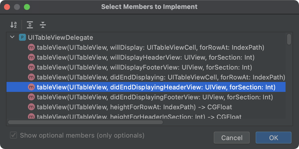 使用快捷键 ⌘N(或者主菜单中的 Code | Generate),可以在 AppCode 中轻松生成许多代码结构。 基于当前上下文、脱字符号位置或代码选择,AppCode 可以为您列出所有可以生成的结构。