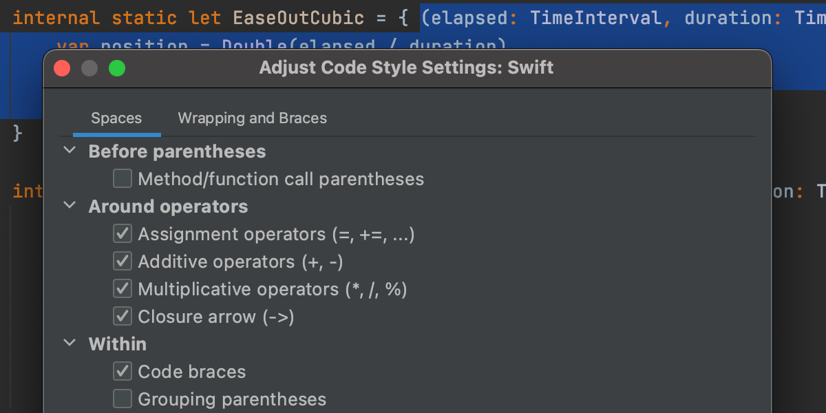 AppCode 还允许您更改仅适用于选定代码片段的设置。 选择代码,然后使用快速修复 Adjust code style settings (⌥Enter)。