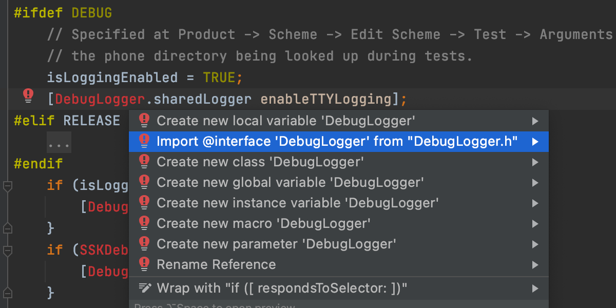 当您开始使用未导入的类时,AppCode 会自动建议添加相应的导入,甚至可在您补全代码时添加导入。