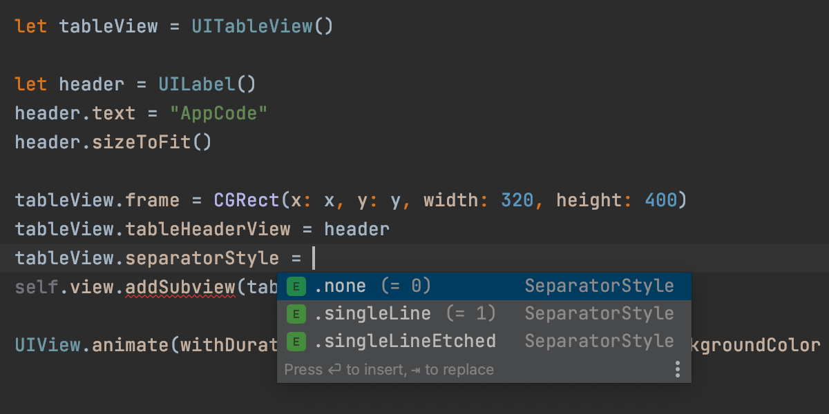 AppCode 提供了两种类型的代码补全:基本的实时输入补全以及更高级的 SmartType 补全 (^⇧Space),后者可以给出更加精确的建议筛选。