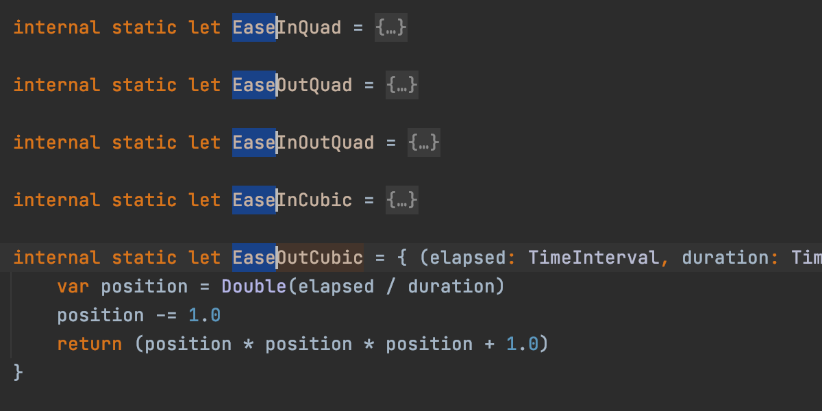 借助 AppCode,您可以同时编辑文件中的多个位置,从而提高效率。 按 ⌥⇧,然后用鼠标选择脱字符号位置,或者按 ^G,将当前单词的下一个匹配项添加到选择中(要从选择中删除,请按 ^⇧G)。 然后,只需在所有这些位置中同时输入代码。 自动补全和实时模板也可以像往常一样正常运行。 要恢复单脱字符号模式,请使用 Esc。