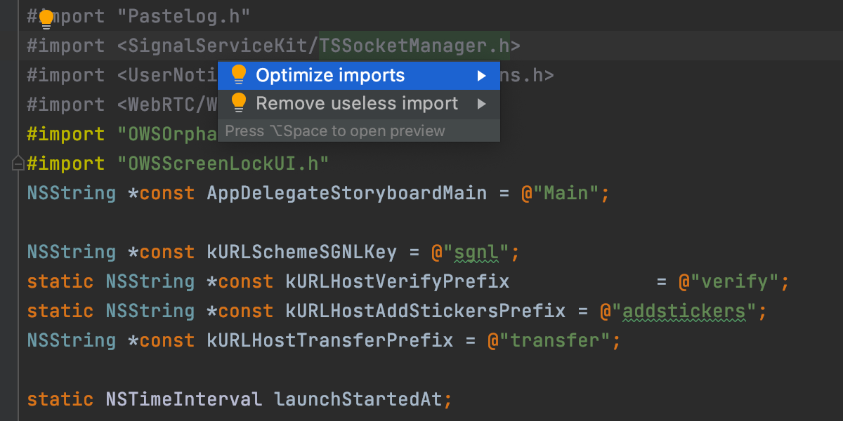借助 AppCode,您可以轻松地从未使用的导入清理整个项目,只需从菜单中调用 Code | Optimize imports 或按 ⌥⌘O。 所有未使用或重复的导入都会在编辑器中高亮显示,让您的代码更整洁。