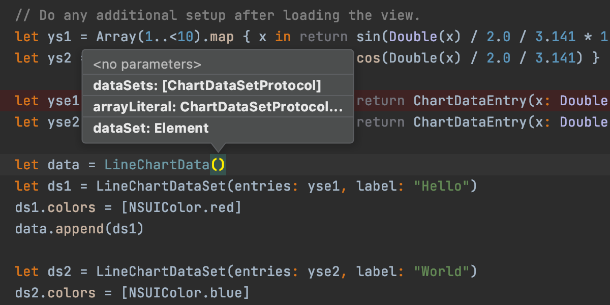 在 AppCode 中,您无需导航或离开当前上下文即可查看方法的实现。 只要将脱字符号放到方法调用上,然后按 ⌥Space。