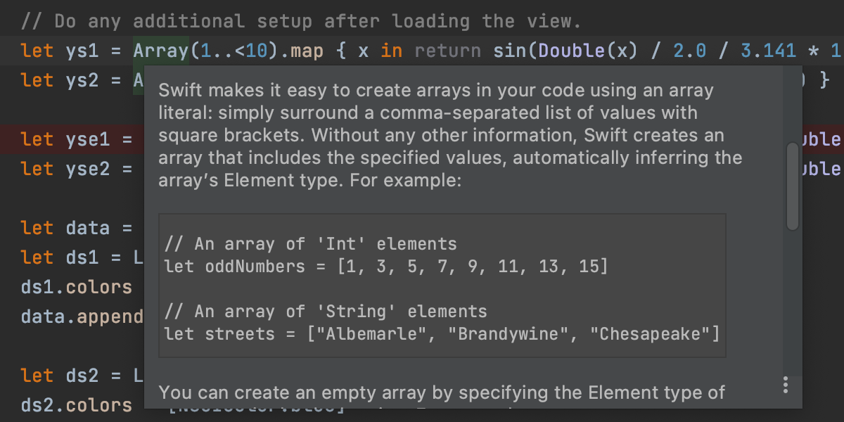 要查看相关文档,请按 F1。 文档在弹出窗口中显示,其中包含其他资源的可点击链接。 快速文档甚至还能为您显示宏替换或 Swift 推断类型。