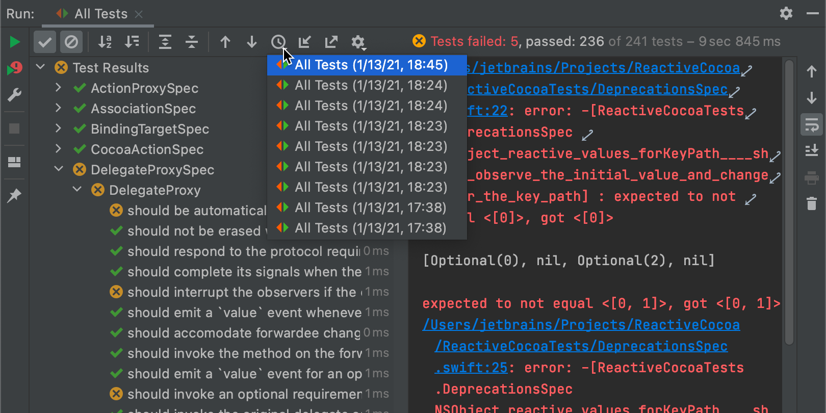 在 AppCode 中,您可以拥有多个可以在特定弹出窗口中执行的测试运行配置。 或者,您也可以直接从编辑器中运行测试:取决于您所处的上下文,AppCode 将运行一个测试或范围中的所有测试,只需按 ⌃⇧R。