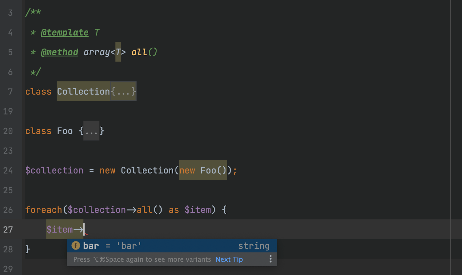我们继续改进对 PhpStorm 中基于注解的泛型的支持。 在此版本中,我们覆盖了更多情况,包括但不限于: