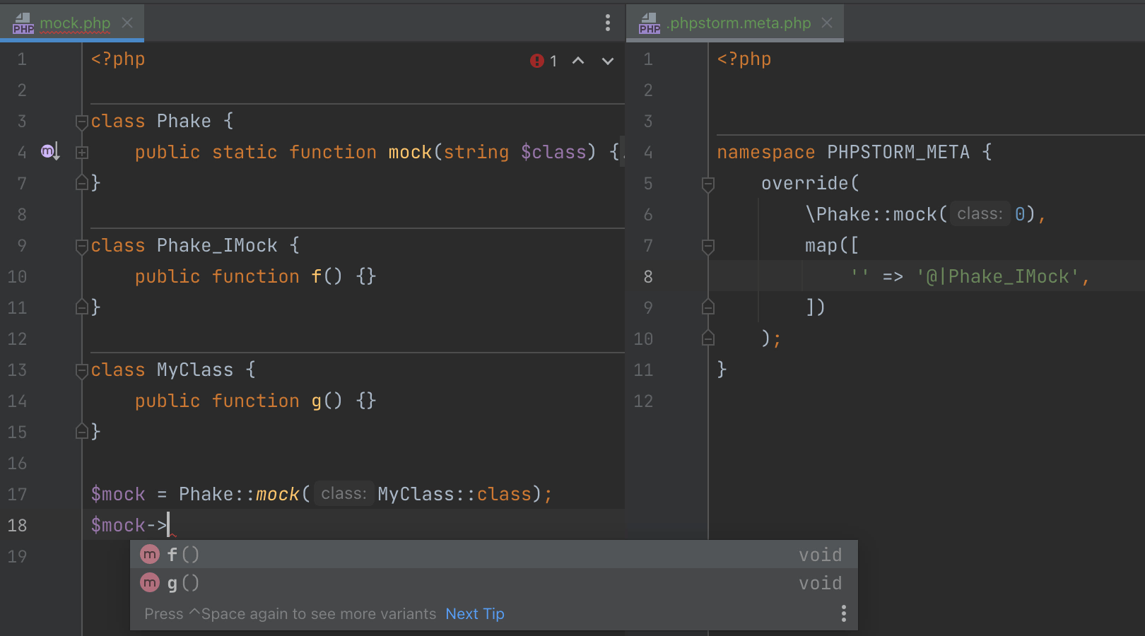 您现在可以在 .phpstorm.meta.php 中将联合体类型指定为 @|MyClass,这样可以改进模拟的编码辅助。