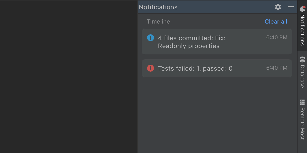 我们将 Event Log(事件日志)实例替换为一个新的 Notifications(通知)工具窗口。 这可以帮助您更好地概括了解 IDE 的通知,确保您不会错过任何重要信息。 新工具窗口默认位于 IDE 窗口的右下角。 所有通知分为两类:Suggestions(建议)和 Timeline(时间线)。