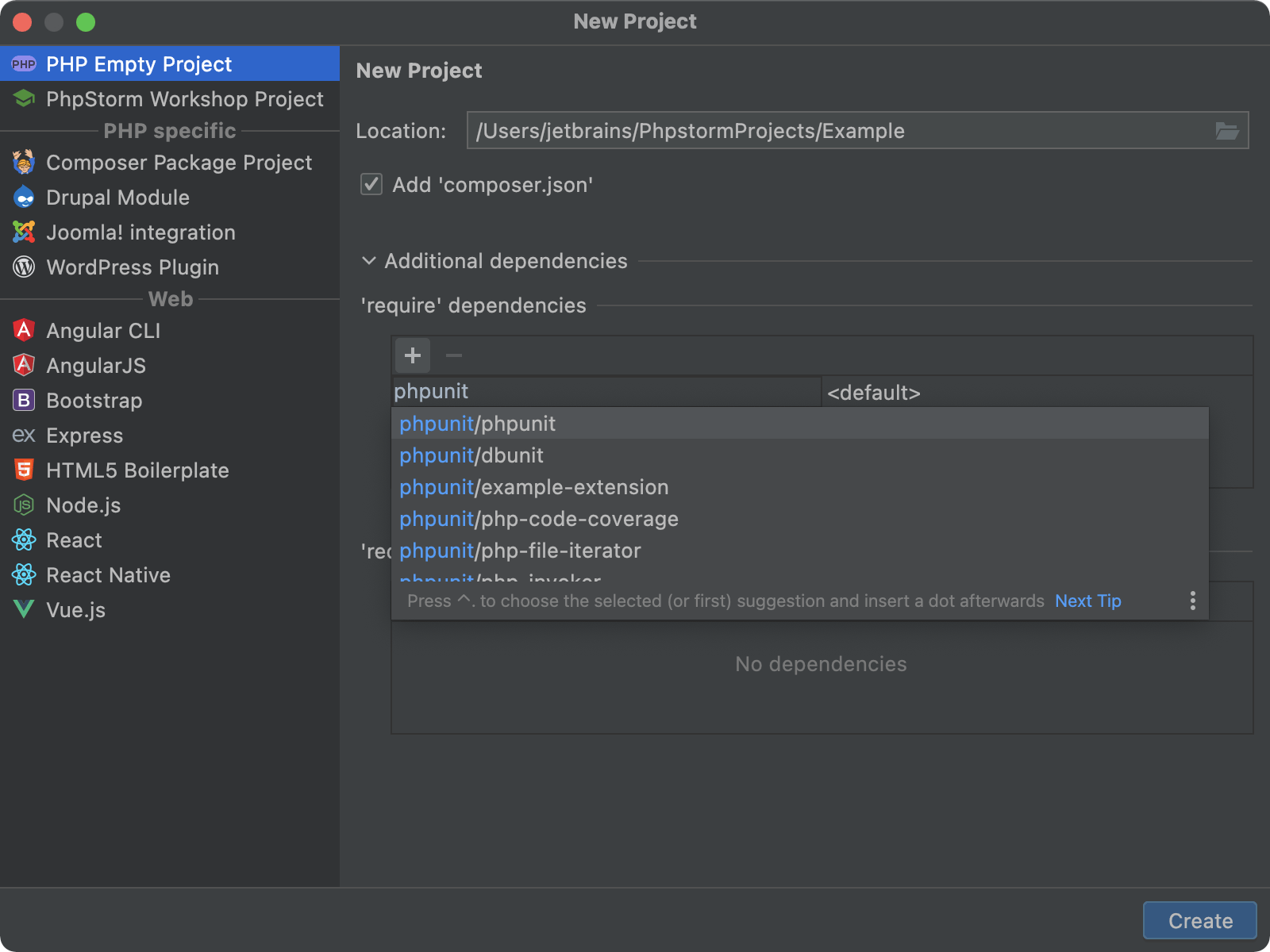 现在,创建新的空项目时,您可以选择自动为其生成一个 composer.json 文件并提供所需依赖项。 创建项目后,PhpStorm 会提示您安装。