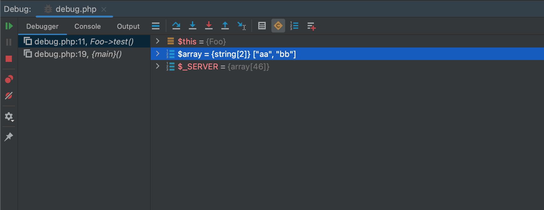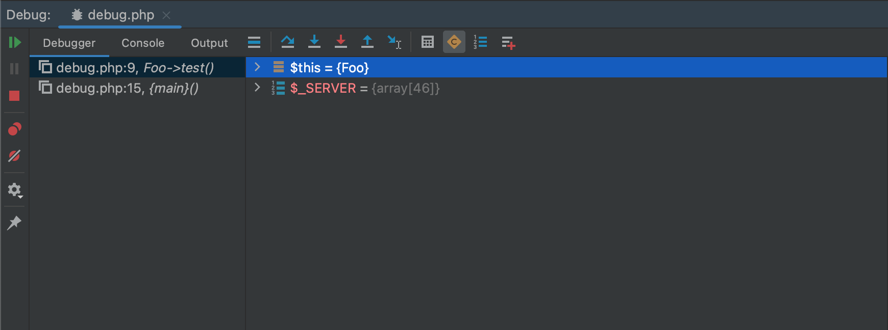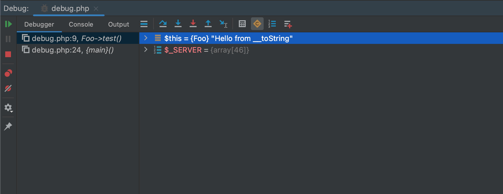 最后,有对象实现 __toString() 方法时,Variables(变量)窗格也会显示该对象的文本表示。