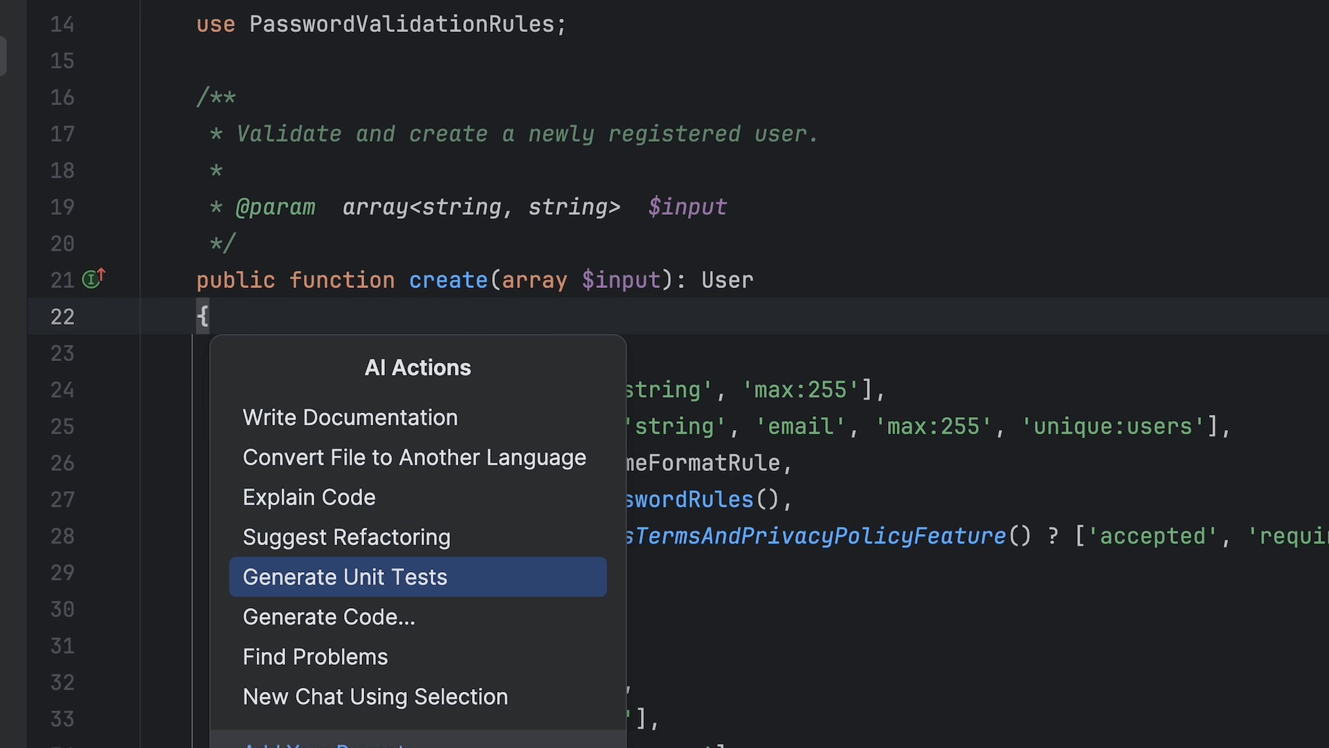 AI Assistant 还可以为类方法生成测试。 将文本光标置于您希望通过单元测试覆盖的类方法上,按 Alt+Enter,选择 AI Assistant,然后选择 Generate Unit Tests(生成单元测试)。