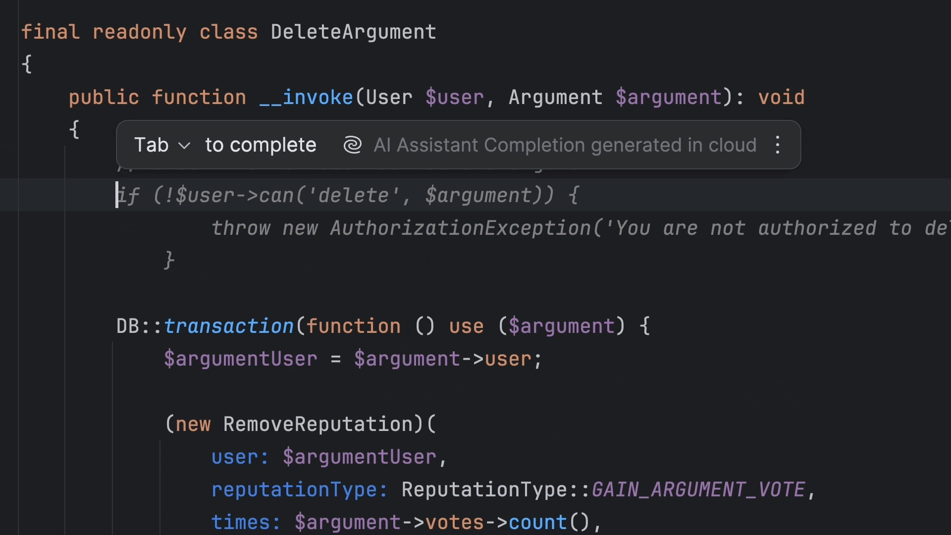 AI Assistant 现在可以为您生成多行代码块。 在新行开始输入,如果有 LLM 建议,就会出现一个灰显的代码段。 按 Tab 接受建议。