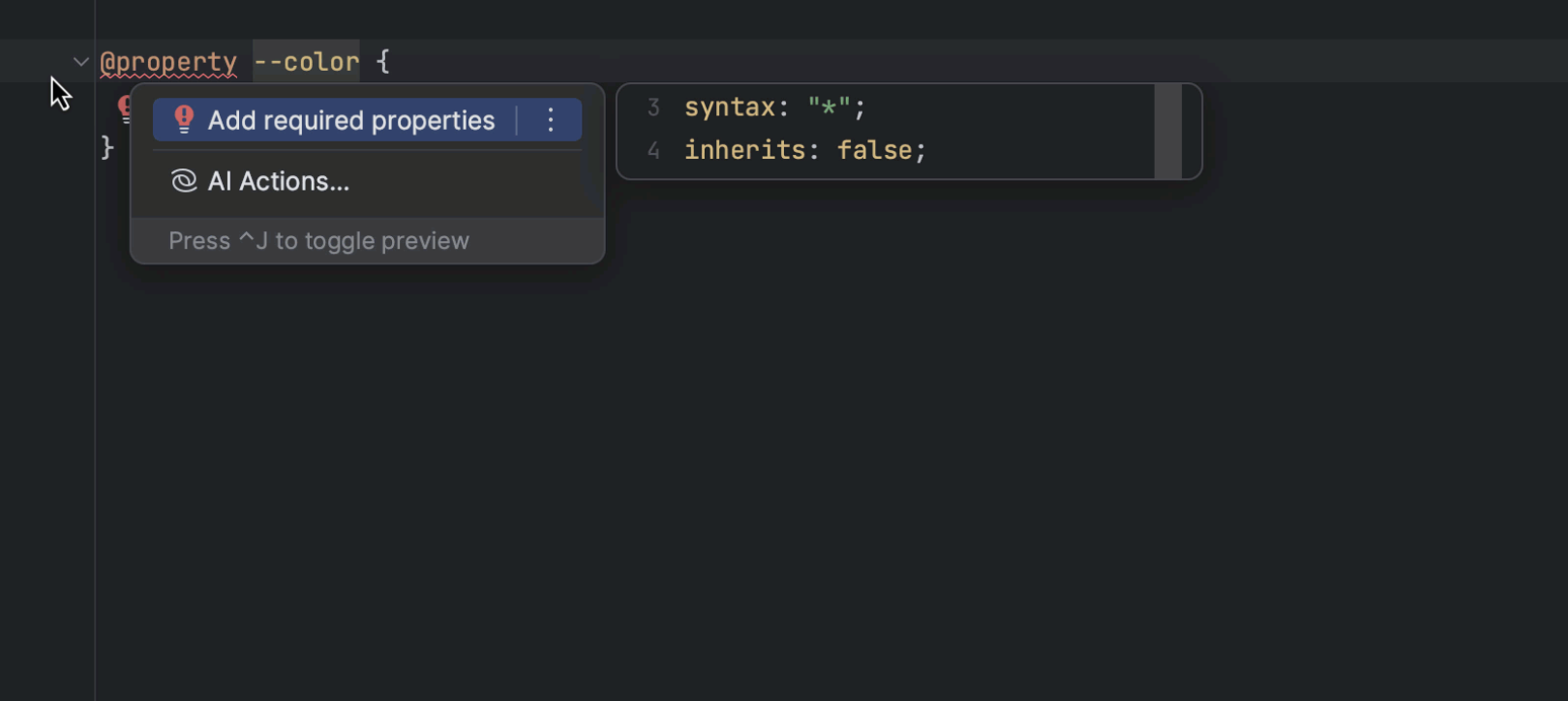 为了支持用于创建自定义 CSS 属性的新 @property API,PhpStorm 2023.3 现已提供用于明确定义 CSS 自定义属性的检查和补全功能,允许您检查和限制属性类型、建立默认值,以及确定自定义属性的继承可能性。