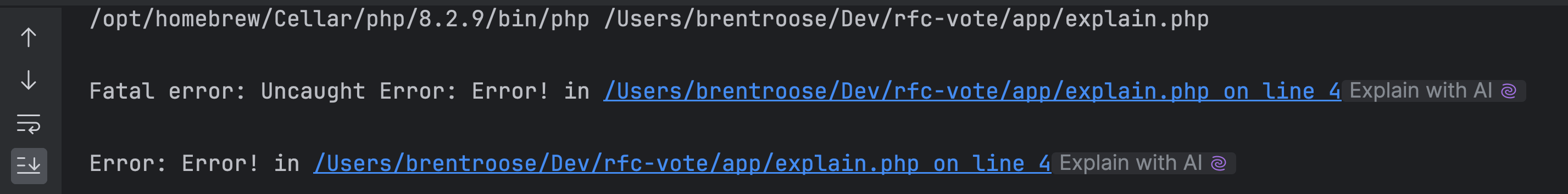 有时,执行 PHP 脚本或运行配置或者运行 Composer 操作时,作业会由于某种原因失败。 AI Assistant 可以帮助您确定问题的根本原因。 点击堆栈跟踪或错误消息中的 Explain with AI(使用 AI 解释)按钮即可获取 AI 生成的解释。