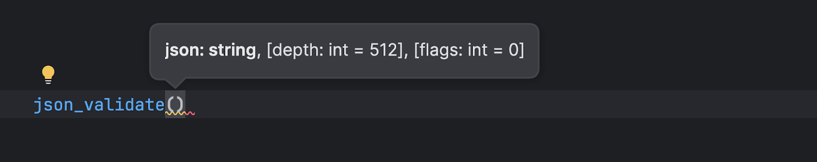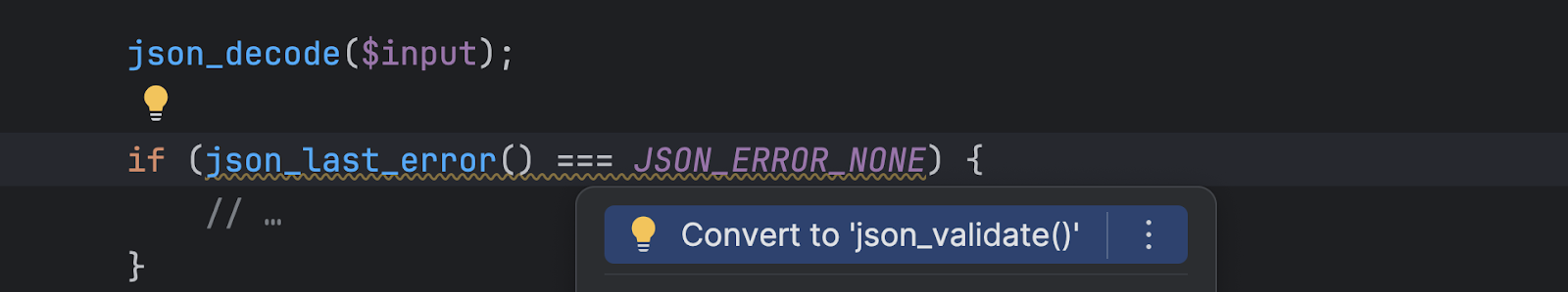 json_validate() 函数 PHP 8.3 向标准库添加了新的 json_validate() 函数。 此前,验证字符串是否为有效 JSON 的唯一方式是对其进行解码并检测是否抛出错误。 PhpStorm 可以检测这些模式,并建议通过 json_validate() 函数调用替换。 与解码字符串相比,它使用的内存更少,因此有助于确认输入是否为有效 JSON。