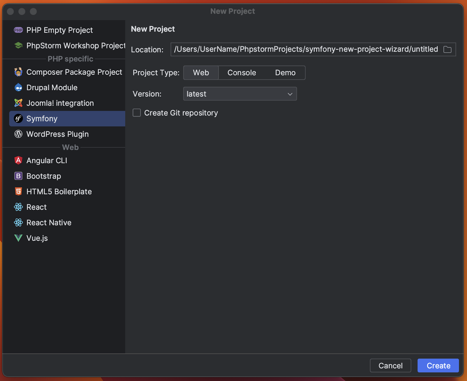 适用于 Symfony 的新内置项目初始化程序允许您直接从欢迎屏幕新建具有所需类型和版本的 Symfony 项目。