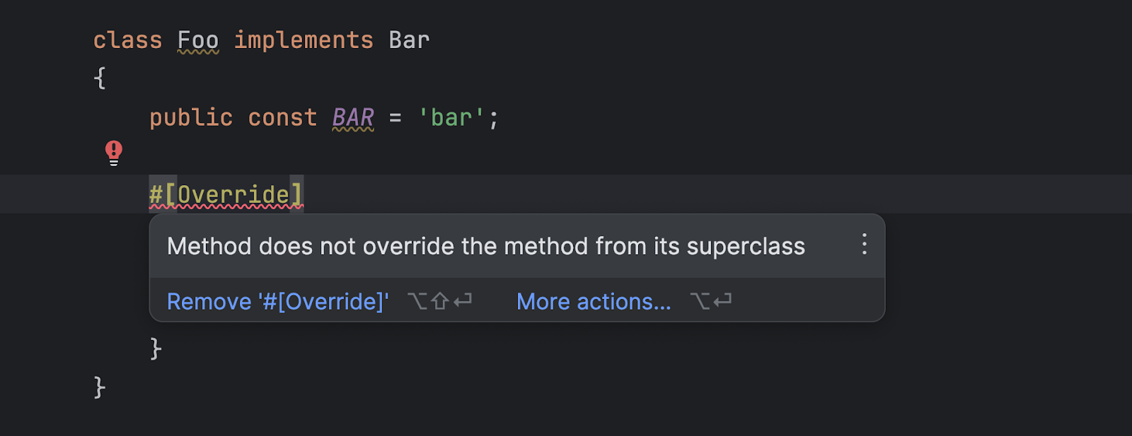 #[\Override] 特性 PHP 8.3 引入了新的 #[\Override] 特性。 重写方法时,它可以明确显示您的意图。 PHP 引擎能够检查标有 #[\Override] 的方法是否实际上重写了父方法,如果未重写,则抛出异常。 PhpStorm 2023.3 会提前发出有关此类情况的警告。