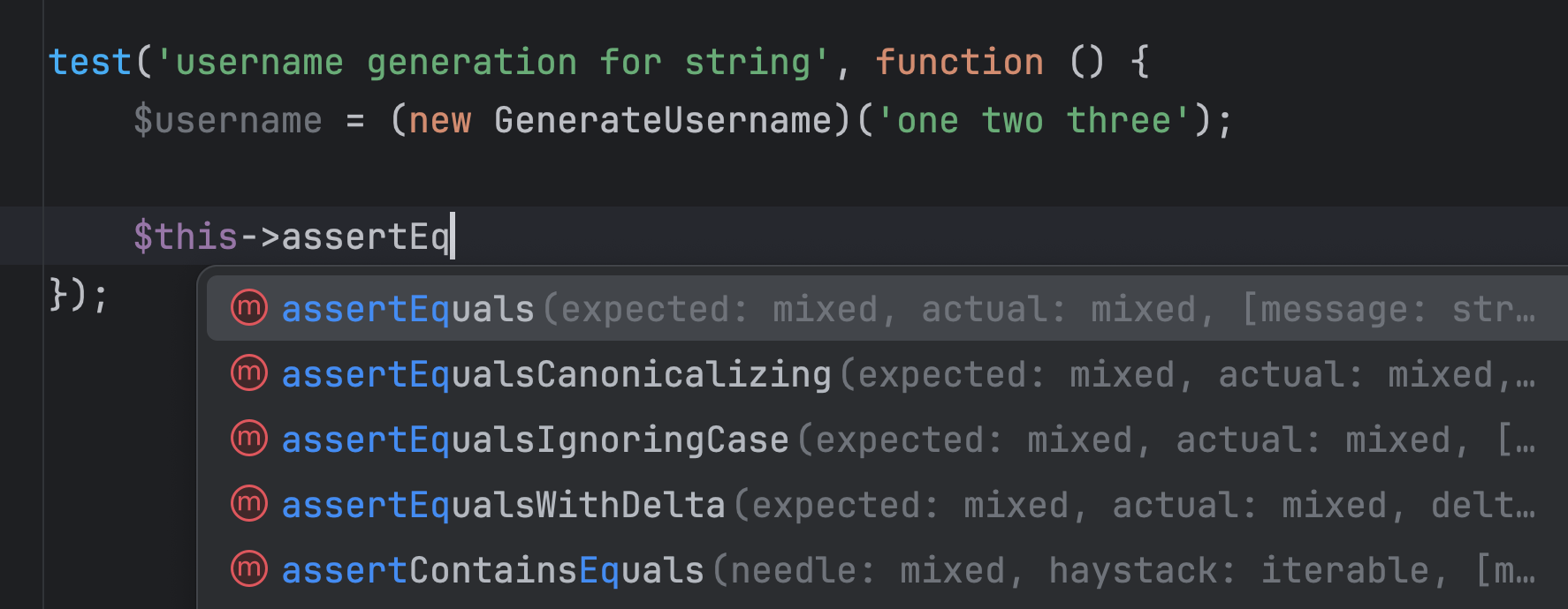 借助新的 Pest 支持,您可以在 $this 上调用函数或方法来编写断言。 这还改进了测试函数中的自动补全,让您可以在输入时查看可用断言。