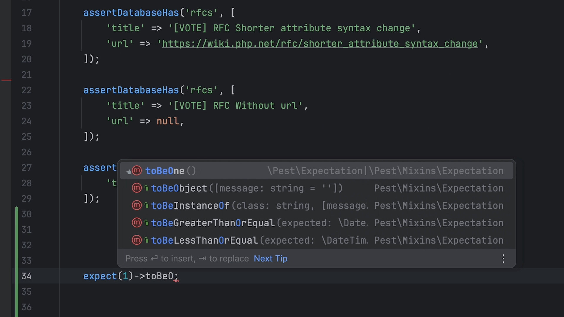 在 Pest 中,您可以编写自定义期望来减少测试中的样板检查。 PhpStorm 可以帮助您找到自定义期望的用法并帮助您重命名。
