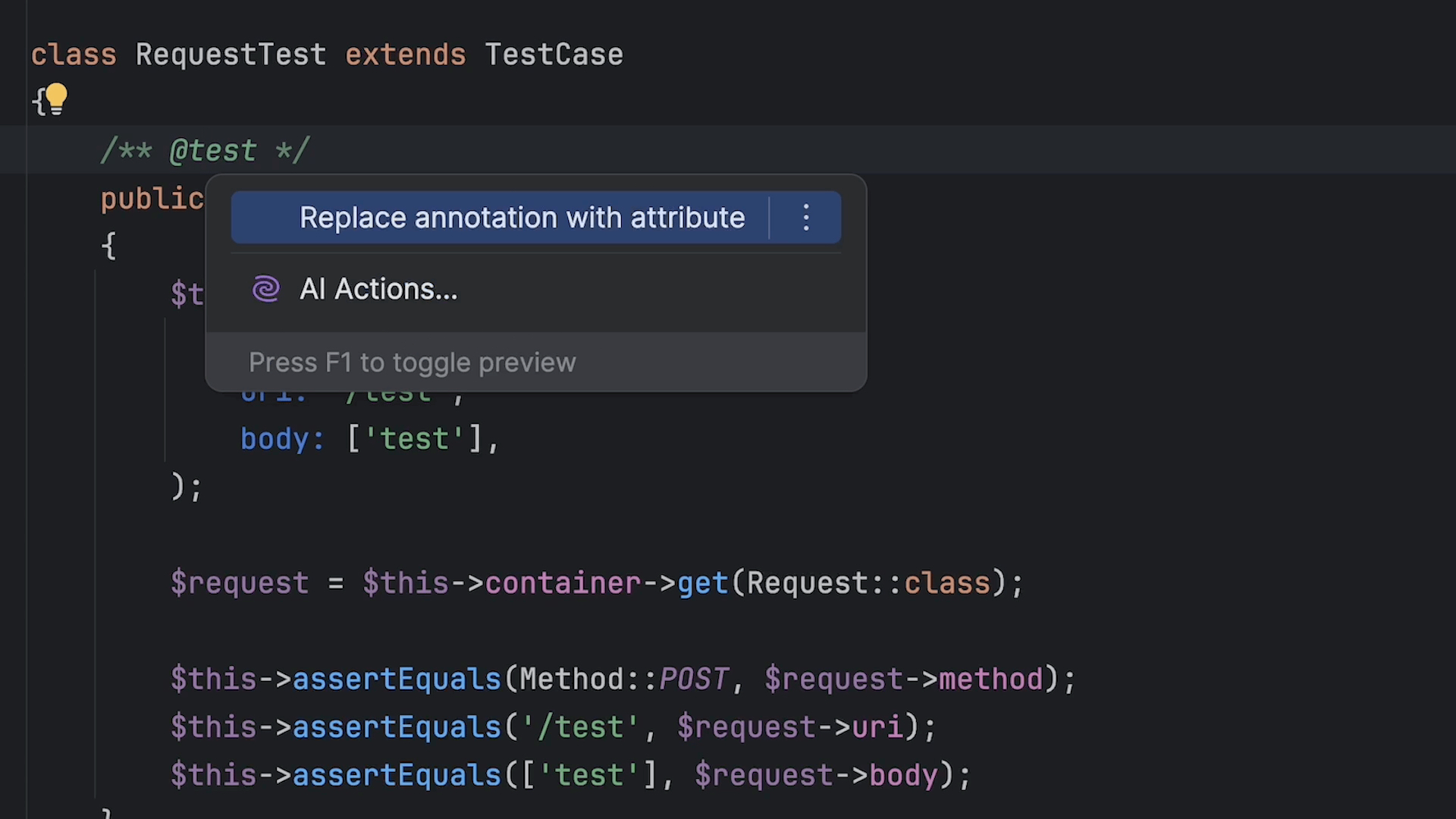 PHPUnit 10 引入了对属性的支持,用于向测试类和测试方法添加元数据,以及被测试的代码单元。 我们已经实现了检查和快速修复,帮助您从旧的 PHPDoc 注解迁移到这种新样式。