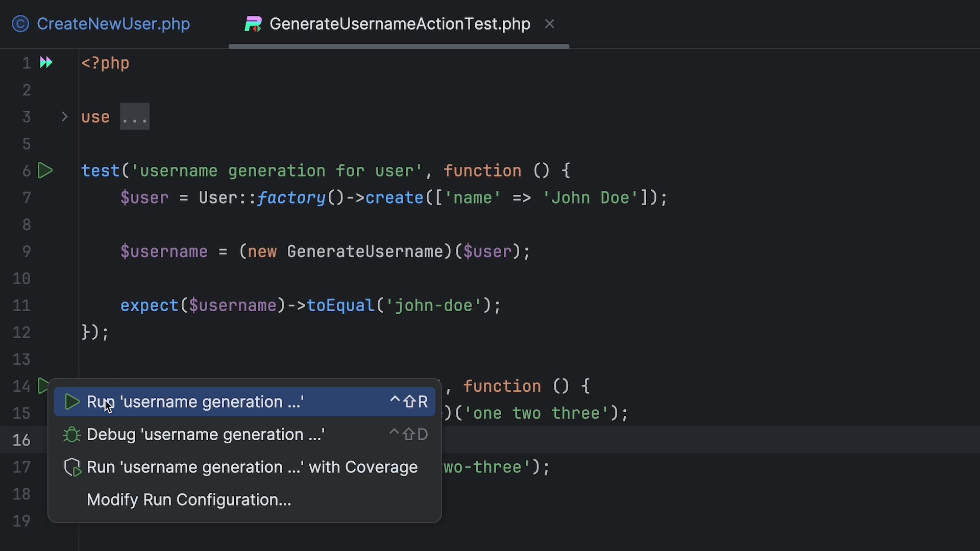 就像 PHPUnit 测试一样,Pest 测试现在可以直接从 PhpStorm 运行。 将文本光标放入测试并触发运行窗口时,将为特定测试创建运行配置。 您可以将文本光标置于文件中,而不是具体测试中,以触发该文件中的所有测试。