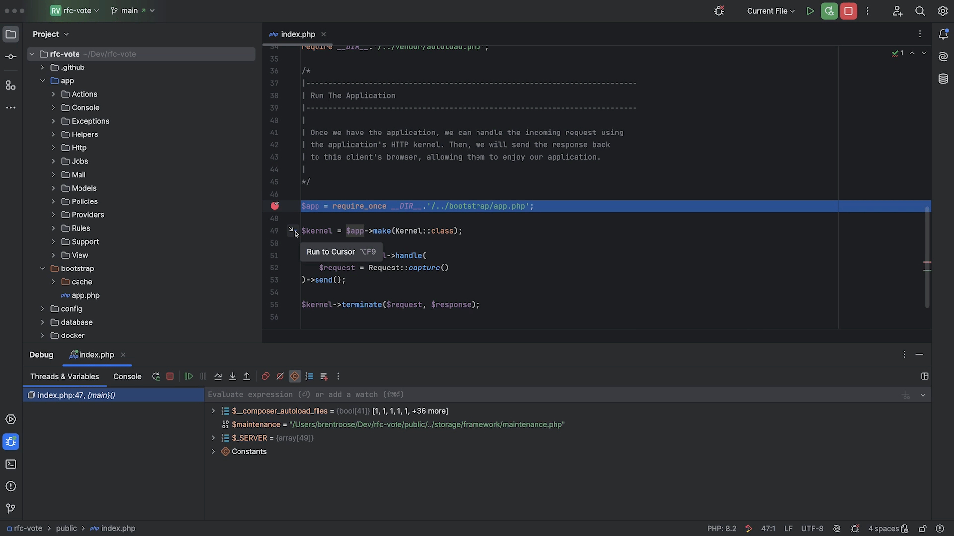 PhpStorm 2023.3 的新 Run to Cursor(运行到光标)嵌入选项允许您在调试时快速执行到特定代码行。 程序挂起后,您可以将鼠标悬停在要执行到的代码行上,然后使用 Run to Cursor(运行到光标)弹出窗口。 将文本光标置于所需行上后调用键盘快捷键 Alt + F9 也可以实现相同的效果。