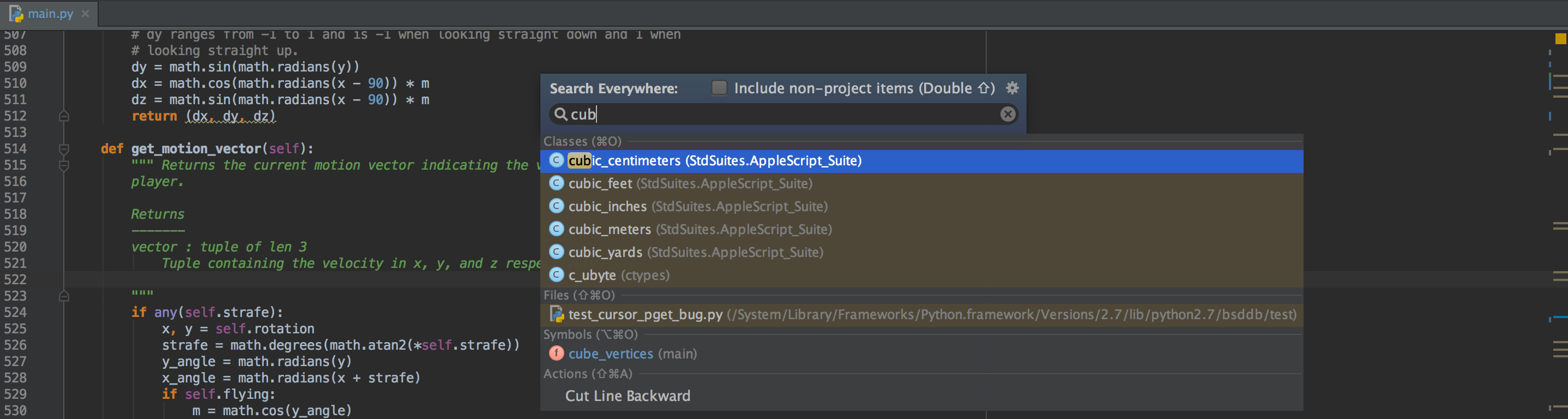 PyCharm可以帮助您查找任何内容,可以是源代码中的项、用户操作或UI元素。 连按两下Shift,然后输入您要查找的内容。 另外,根据您的特定需求配置搜索范围。
