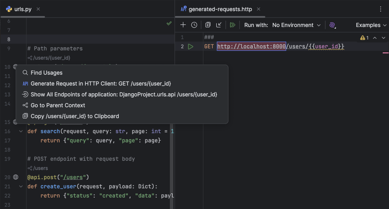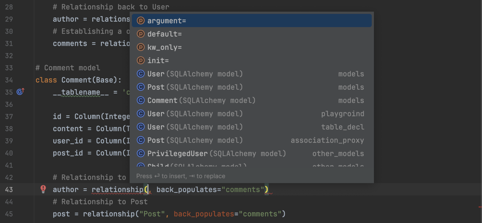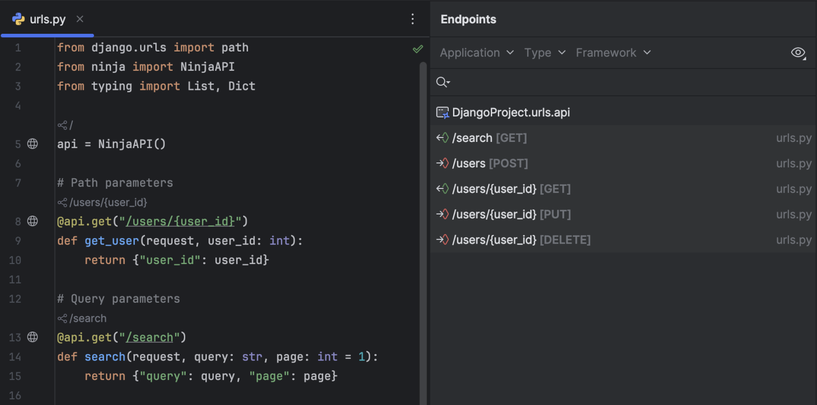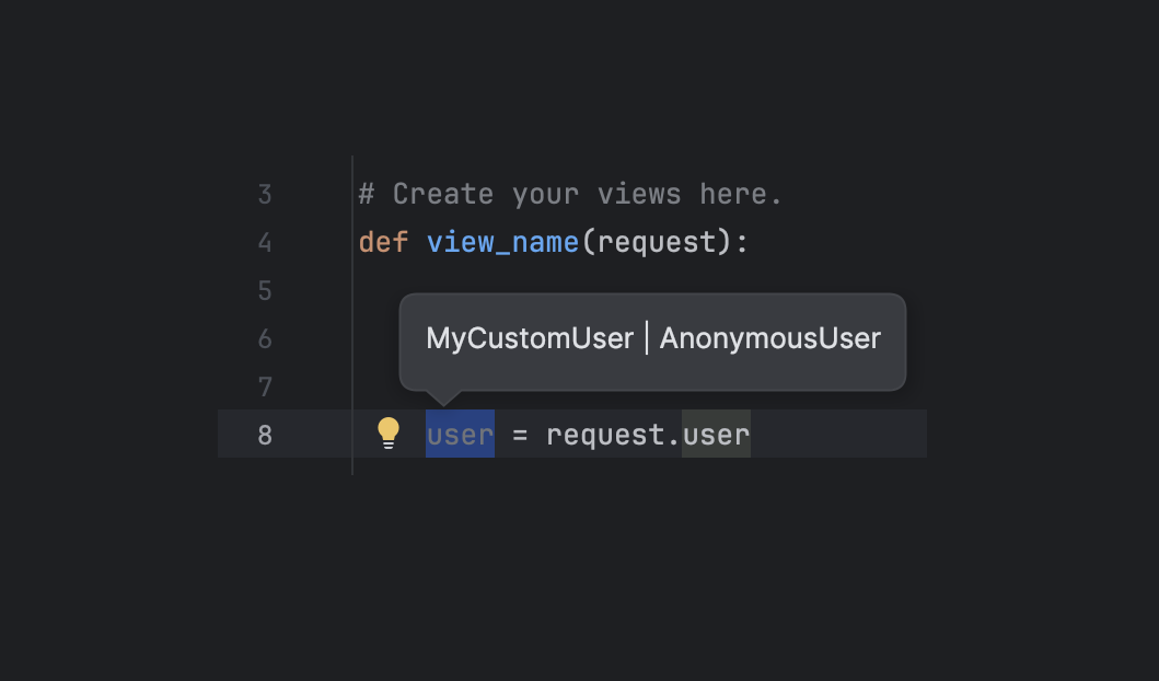 此外,PyCharm 现在支持 Meta 的 Pyrefly,该工具会在您编写代码时内联显示推断出的 Python 类型。 这样,您无需额外执行检查或查看工具提示,即可即时查看类型信息。