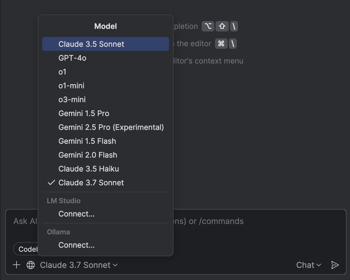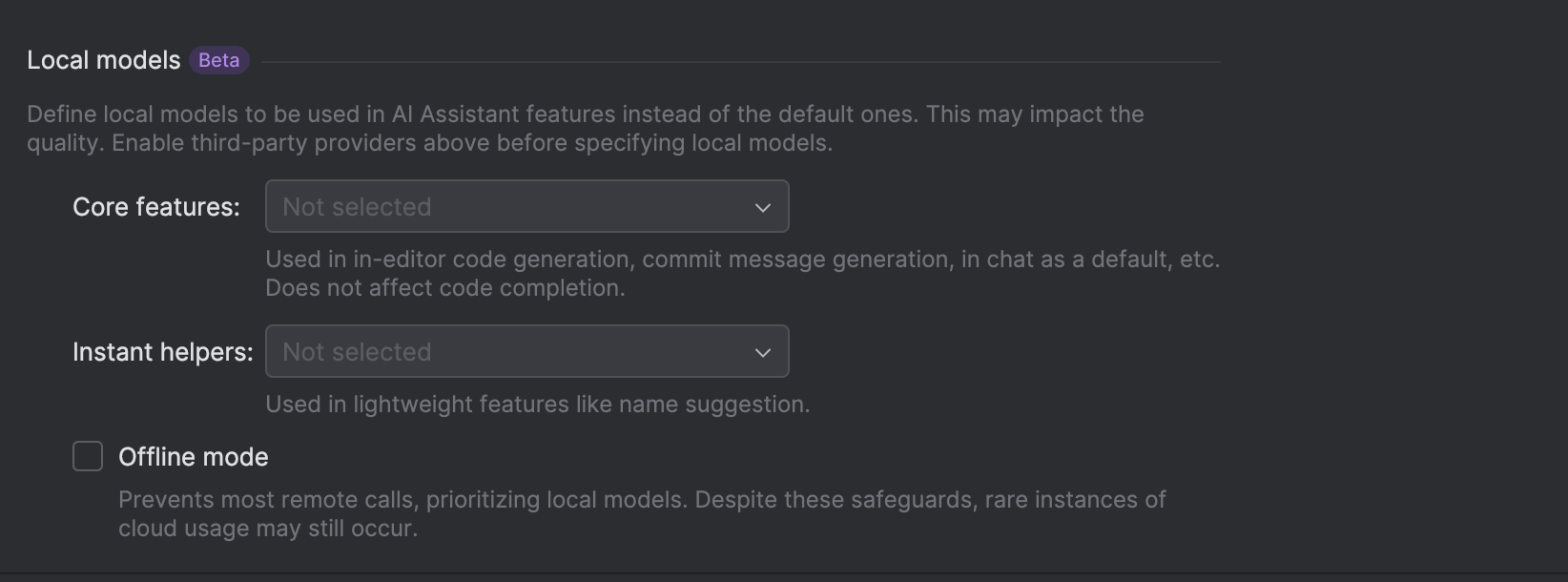 借助 BYOK,您可以关联来自 OpenAI、Anthropic 或任何兼容 OpenAI API 的本地模型的自有 API 密钥,这样,在 JetBrains IDE 中 AI 的使用方式方面,您将拥有更高的灵活性和控制权。 您无需登录 JetBrains AI 即可使用最喜爱的 AI 聊天和智能体,非常适合已有 API 密钥并希望使用自己首选服务提供商的开发者。 此功能预计将在后续的 2025.3.x 版本中推出。