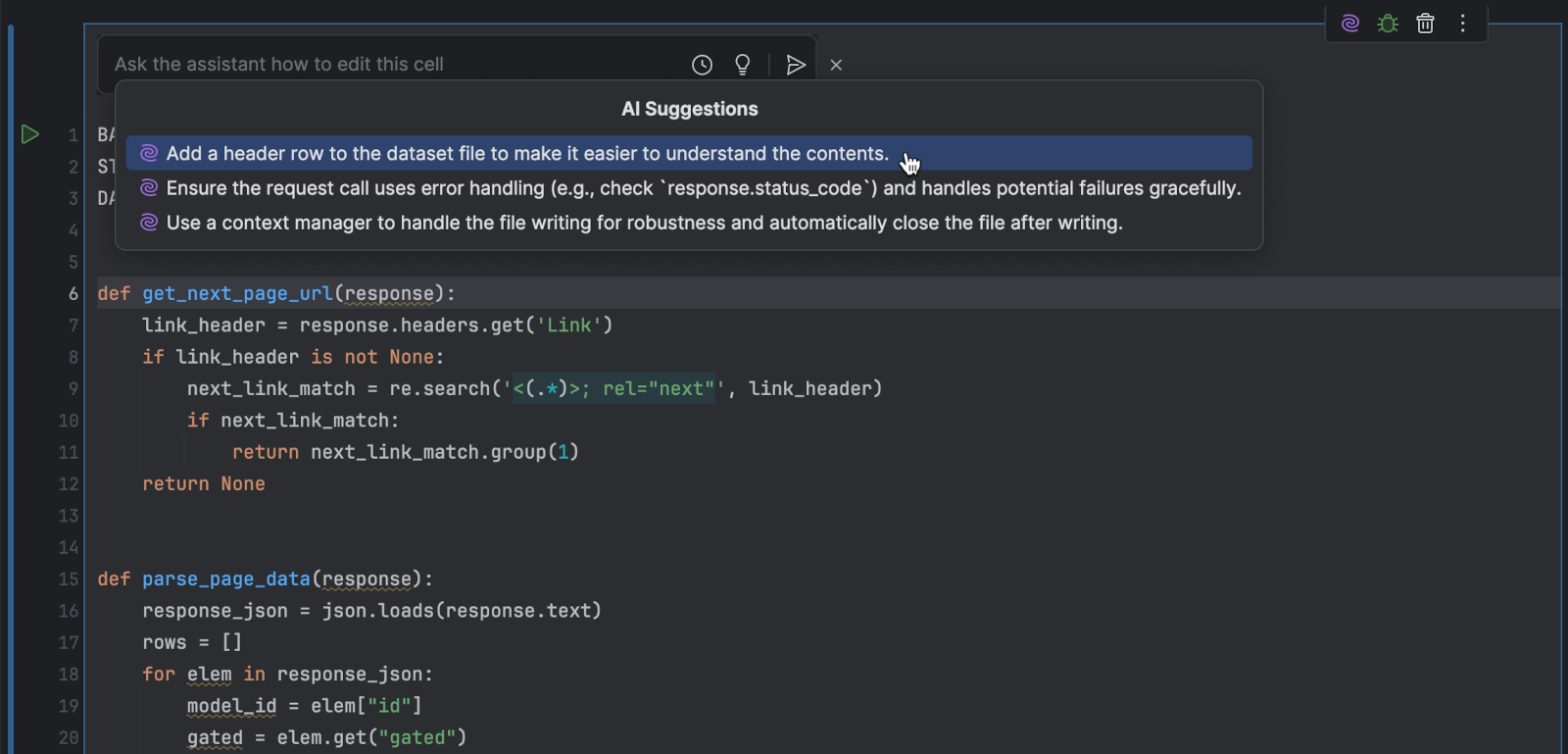 如果检测到任何问题,您可以查看这些问题,并使用 Fix with AI(使用 AI 修正)选项生成代码,该代码会在新的单元中自动解决这些问题。